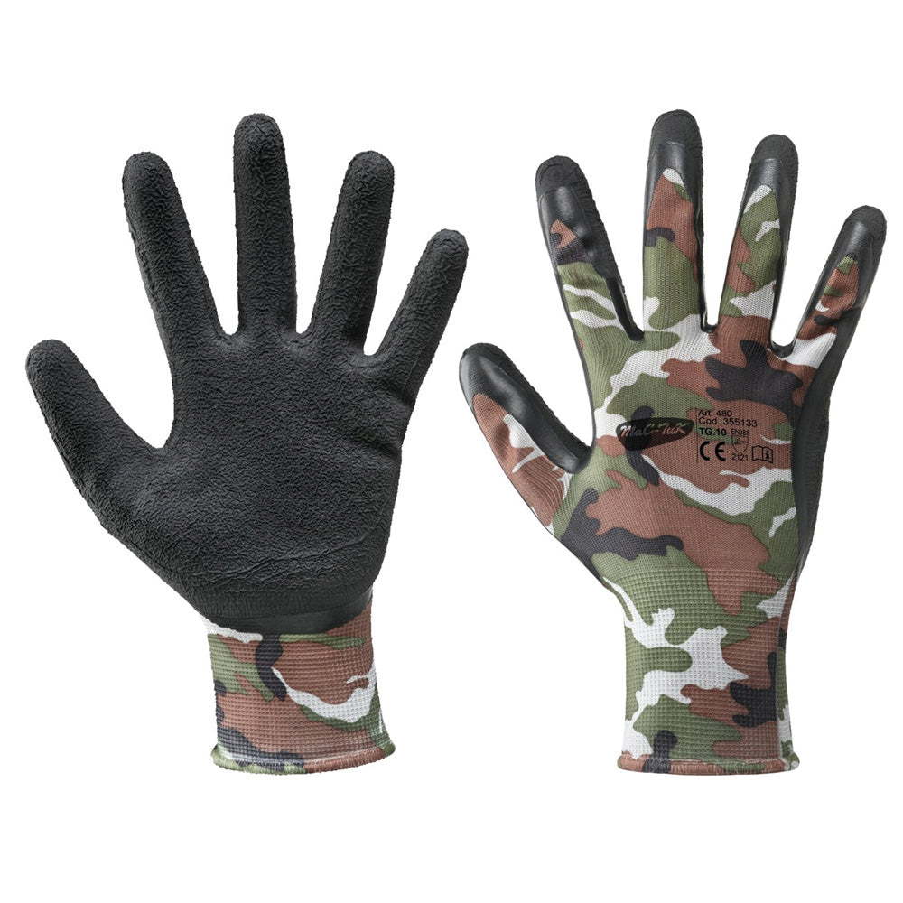 Maglia mimetica con spalmatura in lattice. Supporto in poliestere elasticizzato, palmo ricoperto in lattice schiumato, finitura increspata per presa perfetta su superfici asciutte e bagnate. Ideali per manovalanza in generale, imballaggio, edilizia. CE protezione I, EN 388-2016. In busta appendibile.