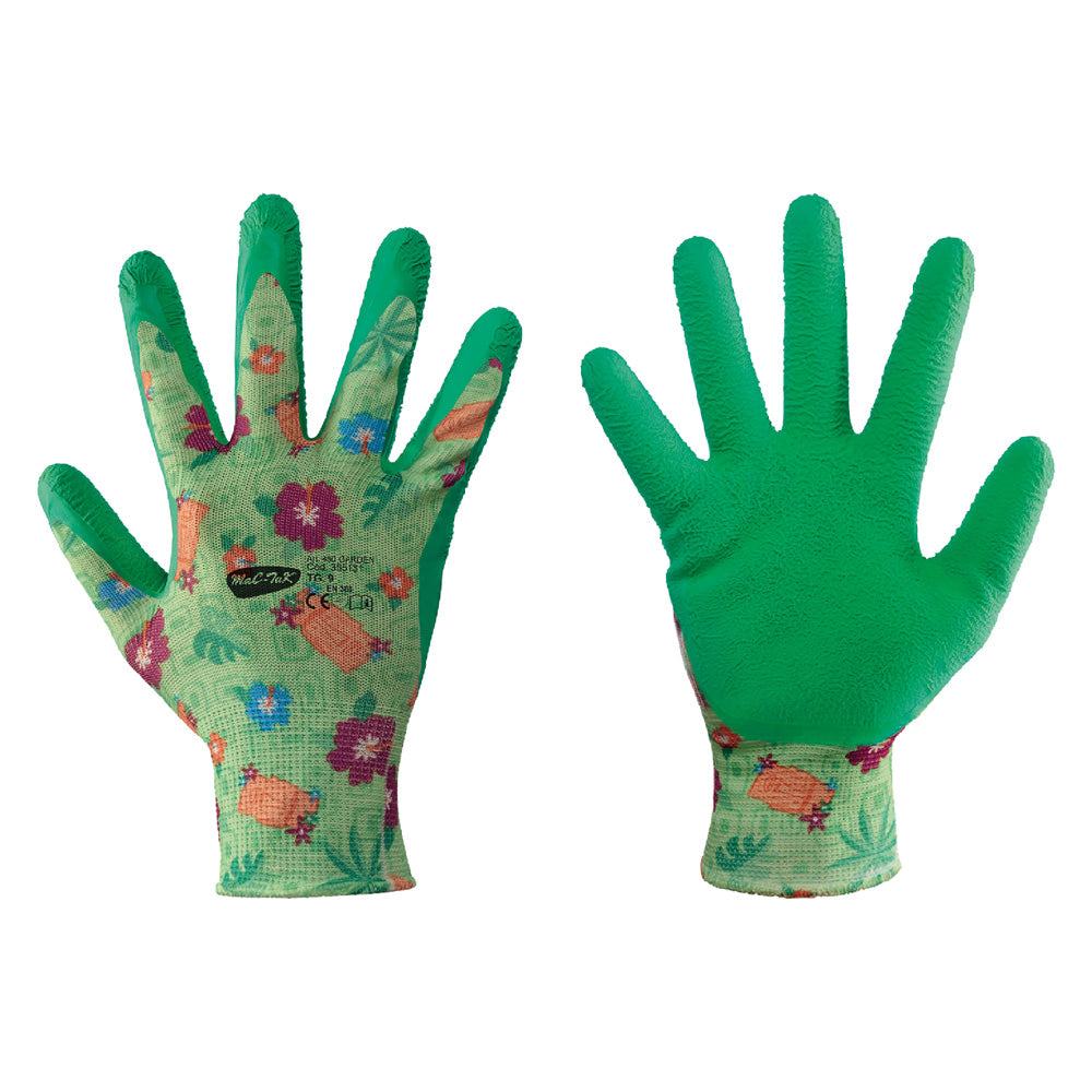 Indicati per lavori di giardinaggio. A filo continuo calibro 13, palmo ricoperto in schiuma di lattice. Finitura su palmo e dita zigrinate per miglior presa sia su superfici asciutte che umide. Polso elasticizzato e dorso aerato. Doppia fantasia e colorazione assortita. Con appendino.