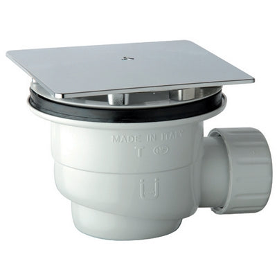 Piletta sifonata per piatti doccia con foro DM 90 con grilgia "Q" mm 120 quadrata in abs cromato. Dotata di chiave per facilitare il montaggio della piletta. Completamente ispezionabile.