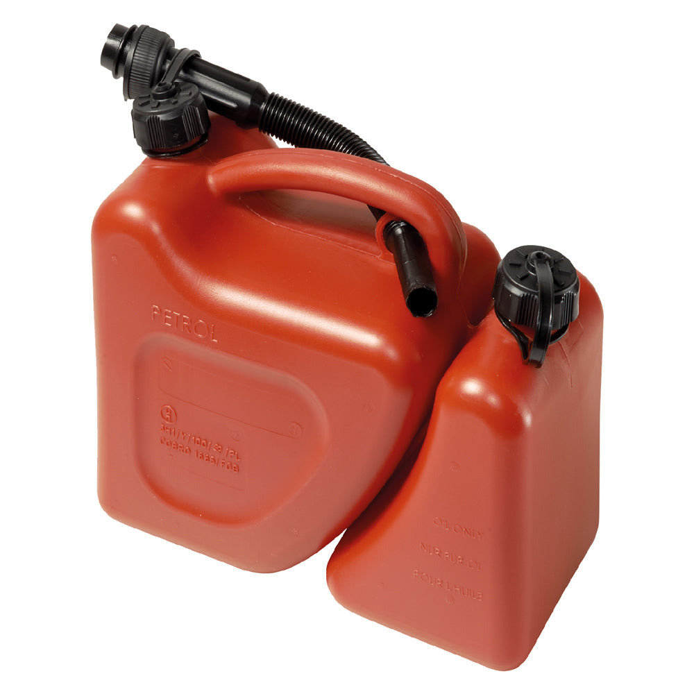 In polietilene neutro alta densità anti UV, con tubo prolunga flessibile per versamento. Prodotto omologato 'UN' per trasporto sia su strada che in mare. Tappo con guarnizione di sicurezza. Per olio / miscela.