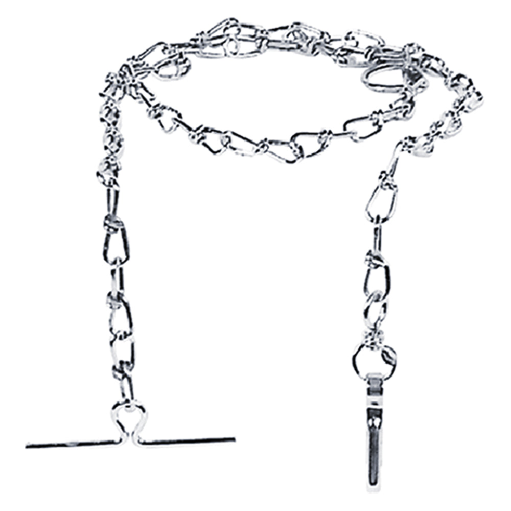 In ferro nichelato. Completa di moschettone e traversino. Lunghezza 110 cm.