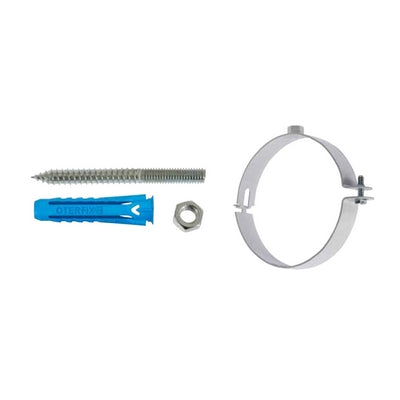 Materiale: DD11 EN 10111; Zincatura elettrolitica UNI ISO 2081:2009 sp. 6-9 um; verniciatura a polvere bianco RAL 9010 sp. 70-80 um. Fornito con tassello in nylon adatto per tutti i materiali base. Utilizzo per fissare tubi scarico fumi.