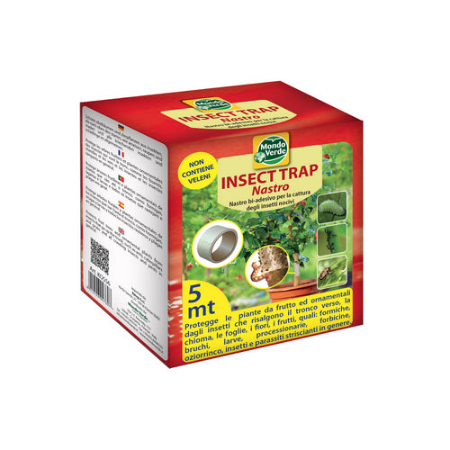 Insect Trap nastro. Nastro bi-adesivo per la cattura degli insetti nocivi. Non contiene veleni. Insect Trap nastro protegge le piante da frutto ed ornamentali dagli insetti che risalgono il tronco verso, la chioma, le foglie, i fiori, i frutti, quali: formiche, bruchi, larve, processionarie, forbicine, oziorrinco, insetti e parassiti striscianti in genere. Gli insetti che risalgono dal terreno, nel tentativo di raggiungere le foglie o i frutti, sono intercettati da Insect Trap nastro e rimangono appiccicati grazie alla colla (priva di sostanze insetticide). La colla è inodore, non si secca per lunghi periodi, non gocciola neanche ad alte temperature, eventuali piogge o irrigazioni non pregiudicano l'efficacia della colla. Consigliato sia per uso interno che esterno. Come si usa: Dopo aver preso la misura del tronco sul quale posizionare il nastro, applicare la parte adesiva allo stesso. Premere il nastro sul tronco quindi eliminare la protezione, lasciando scoperta la parte adesiva, attivando così la trappola.
