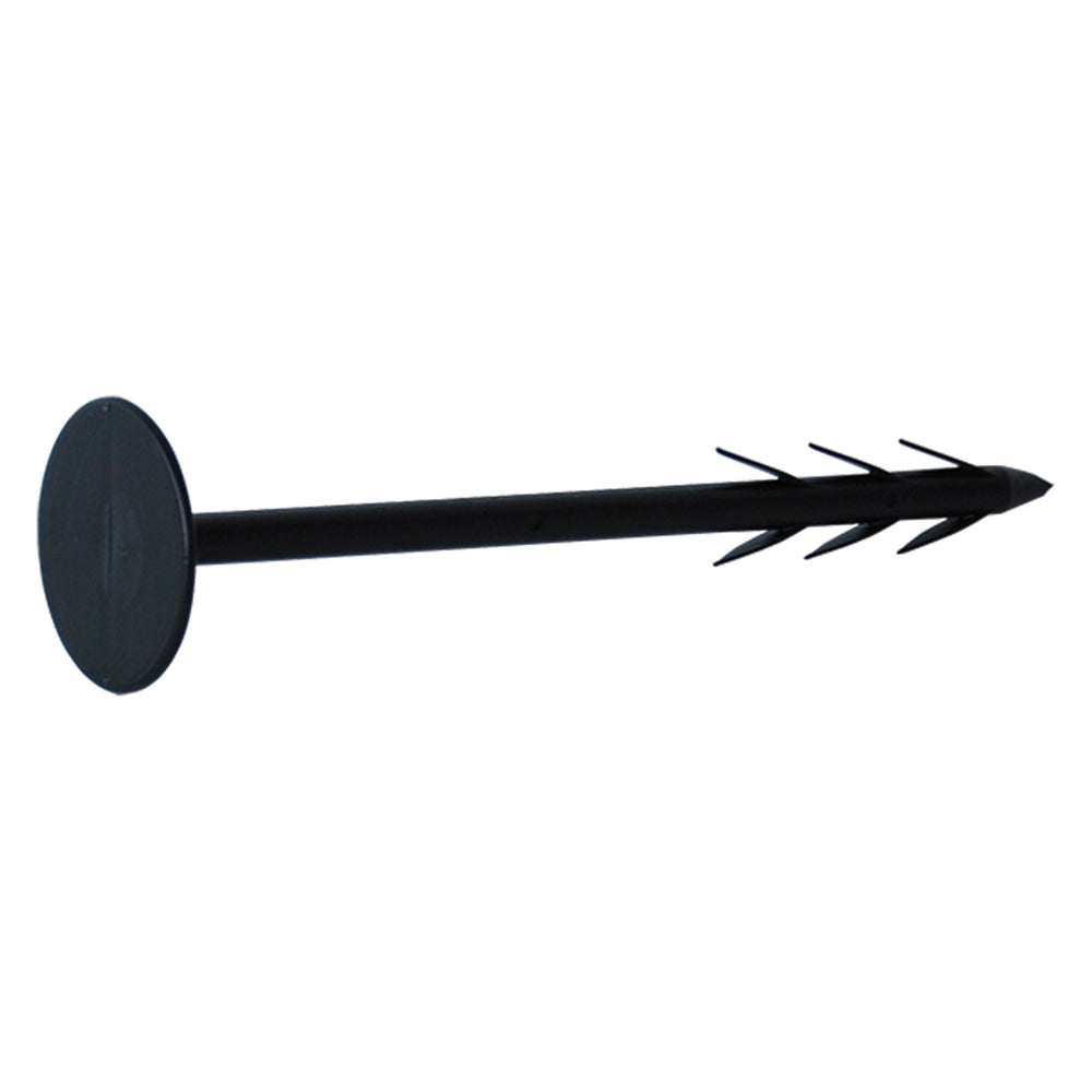 In plastica, con alette. Testa Ø cm 5. Adatto per bloccare teli per pacciamatura al terreno.