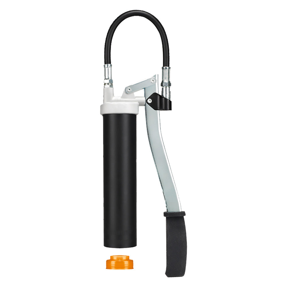 Con meccanismo senza molla. Tramite il vuoto nella testa dell'ingrassatore, infatti, il pistone si muove in su e non ha bisogno di altri supporti, ma viene azionato senza minimo sforzo solo mediante la leva manuale. Pressione di mandata fino a 400 bar, maniglia ergonomica antiscivolo. Completo di tubo flessibile da 300 mm con guarnizione, testina fissa di precisone 4 griffe, pistone. Capacità cartuccia 400 gr.